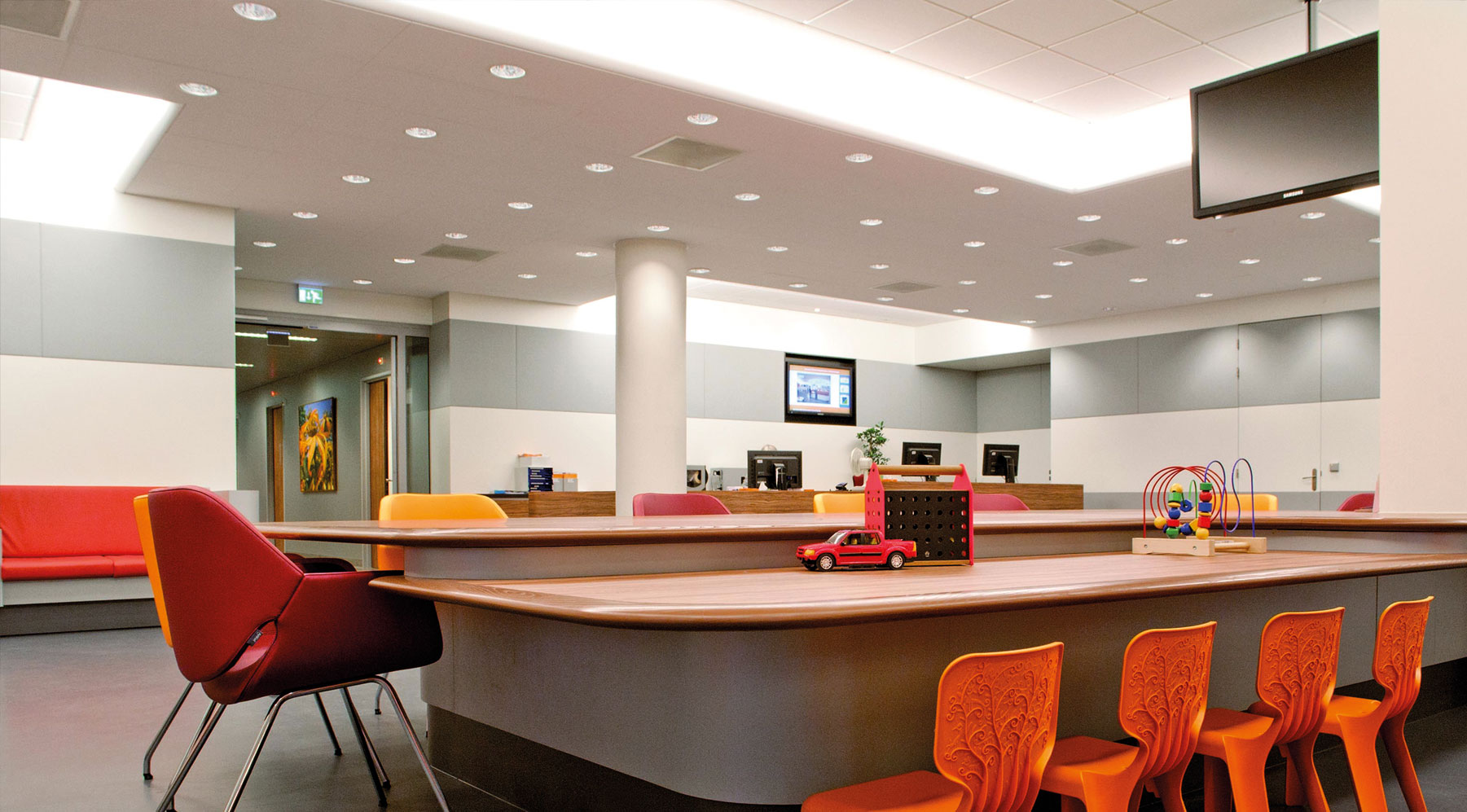 Voor het UMCG hebben we tussen twee bestaande beddenhuizen een tussen lid ontworpen in de ‘voorgeschreven’ stijl van het totaalcomplex. Aan de Oostersingelzijde zijn de vergelijkbare plaatsen al in een eerder stadium bebouwd. Het nieuwe gebouw grenst via de bestaande ruimte voor fitness rechtstreeks aan de Poortweg. De hoofdgebruiker is de afdeling Urolgie die naast de specifieke spreek- en behandelkamers ook een grote wachtkamer heeft. Deze, ‘strak vormgegeven’ ontvangstruimte is het visuele visite kaartje van de afdeling. Het interieur ontwerp kenmerkt zich door de grote maat van de verkeersruimten, de heldere kleurstelling en het pure materiaalgebruik. Het kleurconcept kent verschillende tinten grijs met een helder tint oranje. De vaste meubilering is uitgevoerd in hout en houtachtige afwerkingen met kleur accenten in het (kunst)leer van de zitelementen.